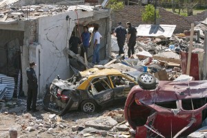 BAS12 – BUENOS AIRES (ARGENTINA) 26/09/11 .- Vista de los destrozos que dejó una explosión en la madrugada de hoy, lunes 26 de septiembre de 2011, en la localidad de Monte Grande, en las afueras de Buenos Aires. Una mujer peruana murió y otras ocho personas resultaron heridas hoy debido a una misteriosa explosión causada, según el relato de los vecinos, por “una bola de fuego que cayó del cielo”. EFE/Leo La Valle